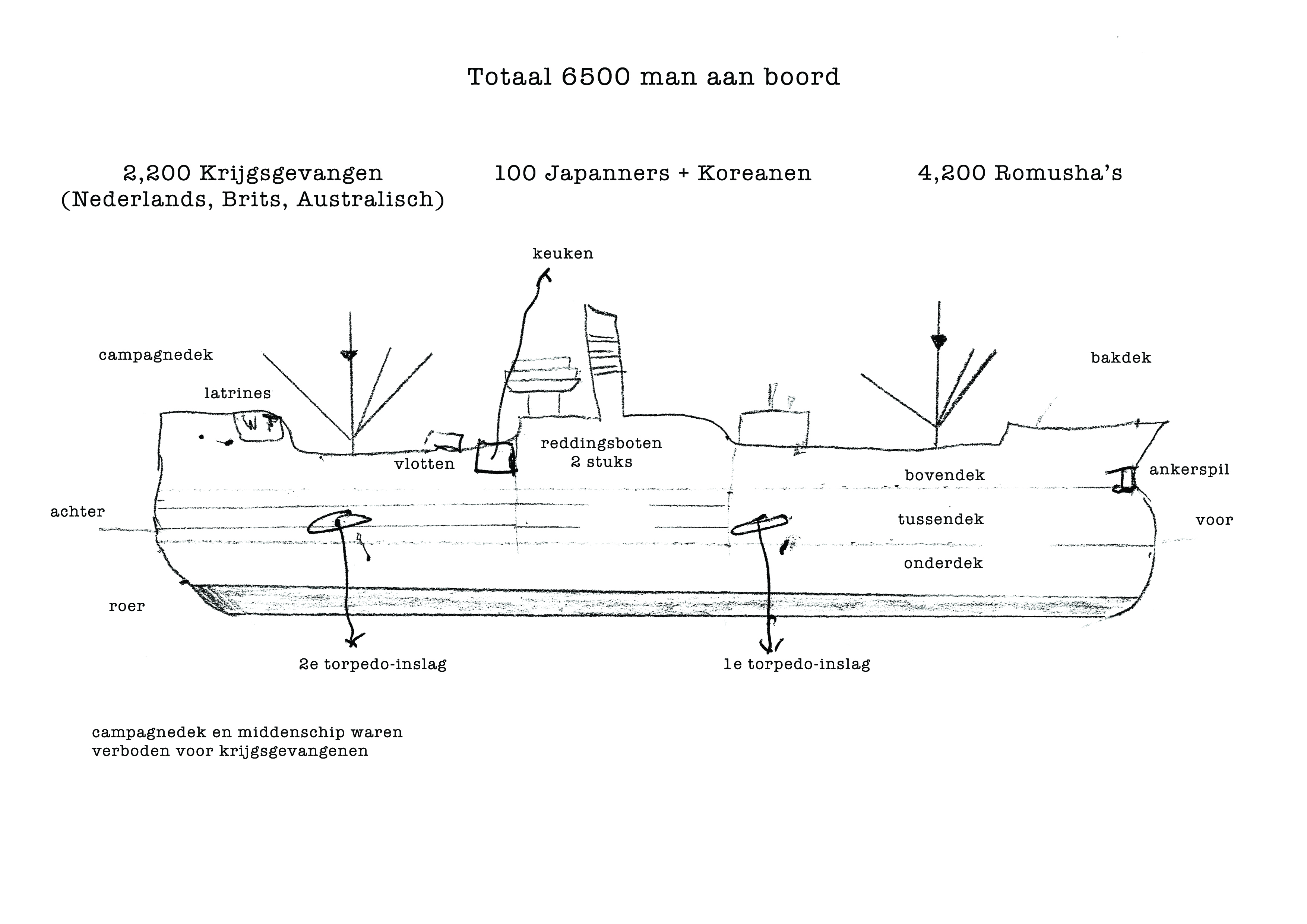 Voor in het schip zaten ongeveer 4.000 Indonesiërs en achterin zo’n 2.300 vooral Nederlandse krijgsgevangenen. Midscheeps - op de brug - en op het campagnedek achter bevond zich de Japanse bewaking. Ik denk dat er zo’n 200 goed bewapende soldaten waren. Niet-Japanners mochten niet midscheeps of op het campagnedek komen. Midscheeps waren er twee reddingssloepen, één aan stuurboord, één aan bakboord ‘that’s it, no more.’ Die twee sloepen konden maximaal 60 tot 70 mensen vervoeren. Die waren dus alleen bestemd voor de Japanners. Niet voor ons, wij waren met te veel.
